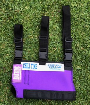 The cooling collar is designed to provide a relatively large contact area on either side of the neck, which can be cooled using crushed ice to create a 'heat sink' effect in the tissues that surroung the artery and vein. Three elastic straps are strategically located so that 'one size fits all' and provides adequeate pressure around the horse's neck to hold the collar in place. Preliminary investigations show that horses tolerate the collar particularly well.
